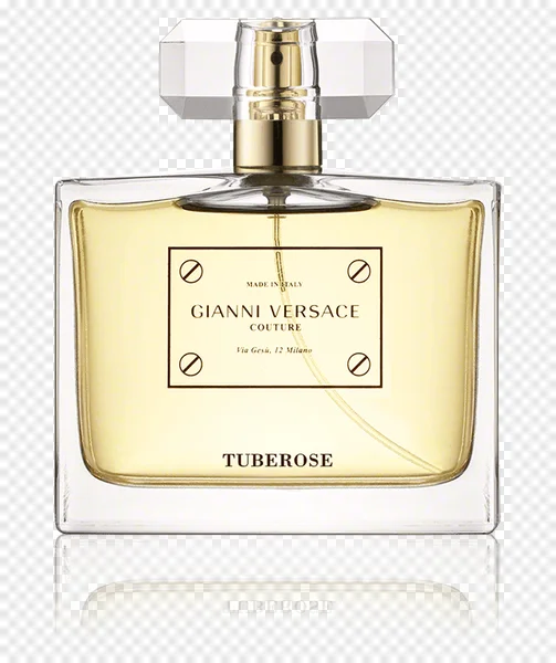 Download a high-quality, transparent PNG of the exquisite Gianni Versace Couture Tuberose perfume bottle. This elegant clear glass bottle, featuring a golden sprayer, a faceted cap, and a distinctive beige label with 'TUBEROSE' and 'MADE IN ITALY', exudes luxury and sophistication. Perfect for beauty blogs, product mockups, graphic design projects, e-commerce websites, or any creative endeavor needing a touch of high-end fragrance imagery. Get this stunning Italian designer perfume bottle image for free to elevate your digital content.