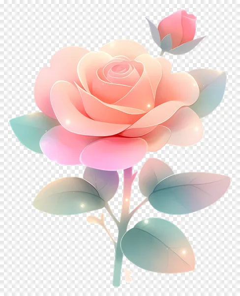 Download this stunning glossy pastel pink rose and delicate rosebud PNG for free. This high-quality, transparent floral illustration features a beautifully rendered main rose with soft peach and pink gradients, shiny, almost translucent petals, and elegant teal-blue leaves. A small, unopened rosebud accompanies the main bloom, adding to its charm. Perfect for adding a modern, dreamy, and romantic touch to your creative projects. Use it for digital art, wedding invitations, greeting cards, scrapbooking, website design, social media graphics, or any personal and commercial use requiring a beautiful and versatile flower graphic. Get your free transparent rose today!