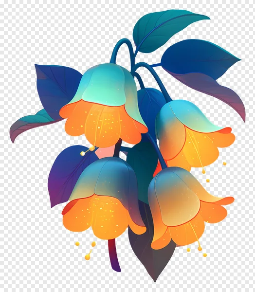 Tags: bell flowers blue leaves botanical art bright colors digital illustration dreamlike flowers enchanted plant fantasy floral flower illustration glowing flowers graphic design element luminous flowers magical blooms mystical garden nature fantasy orange glow surreal art teal petals transparent PNG vibrant plant