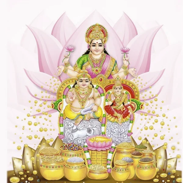 Download this stunning free PNG featuring Goddess Lakshmi, Lord Kubera, and a third deity, surrounded by symbols of immense wealth and prosperity. This vibrant image showcases golden coins, overflowing pots of grain, and other auspicious elements against a beautiful pink lotus backdrop. Perfect for Diwali greetings, spiritual designs, cultural projects, or adding divine blessings to your digital art. Get this high-quality, transparent background graphic to symbolize abundance, good fortune, and success in your creations. Enhance your designs with these powerful Hindu deities associated with wealth and well-being. Ideal for festive banners, invitations, and religious content. Encourage wealth and good fortune in your designs!