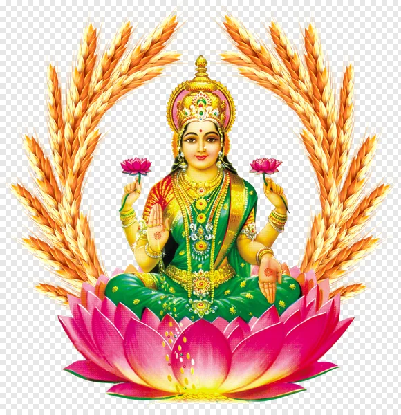 Download a beautiful, high-resolution PNG image of Goddess Lakshmi, the Hindu deity representing wealth, prosperity, and good fortune. Perfect for Diwali decorations, spiritual artwork, presentations, or any project needing a divine touch. This transparent background image is free to use for personal and commercial projects. Enhance your designs with this stunning depiction of Lakshmi seated on a lotus flower, surrounded by sheaves of wheat. Get your free download now!