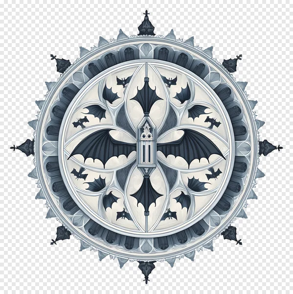 Download this stunning, free transparent PNG of an intricate Gothic Bat Emblem. This highly detailed circular design features a symmetrical arrangement of flying bats, ornate architectural elements reminiscent of a rose window, and a central spire resembling a bat-winged structure, all rendered in a captivating monochrome palette. Perfect for Halloween projects, dark fantasy themes, game assets, logos, T-shirt designs, or adding a mystical and elegant touch to your creative designs. Get this high-quality graphic with a transparent background for instant use and elevate your visual content!