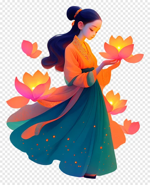 Download this stunning free PNG of a graceful East Asian woman elegantly adorned in a vibrant orange and teal traditional dress, reminiscent of Hanfu style. She gently interacts with radiant, glowing lotus flowers against a transparent background. This high-quality digital illustration captures cultural beauty and fantasy, perfect for adding an ethereal touch to your graphic design projects, presentations, web design, or digital art compositions. Enhance your creative work with this serene and captivating female character illustration. Get your transparent image instantly!