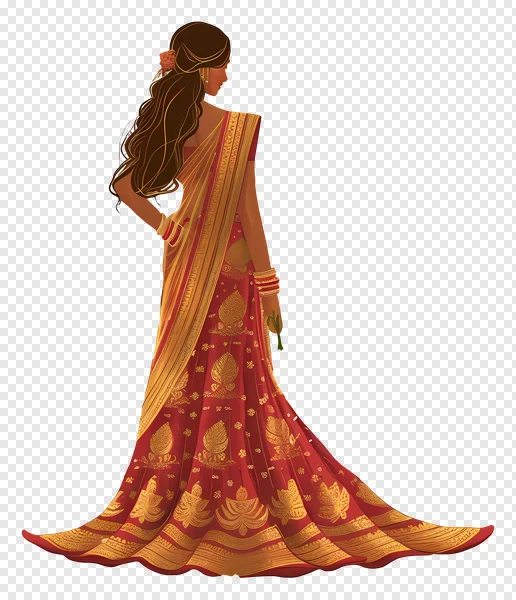 Capture the essence of traditional Indian beauty with this stunning free PNG image. Featuring a graceful Indian woman adorned in a magnificent red saree, intricately detailed with rich golden embroidery and patterns, this illustration exudes elegance and cultural charm. Her long, flowing hair is styled beautifully, complemented by subtle jewelry and a delicate flower. Perfect for design projects, cultural event promotions, greeting cards, wedding invitations, or adding an ethnic touch to your digital art. Download this high-quality, transparent background PNG instantly and enhance your creative work with a touch of South Asian splendor.