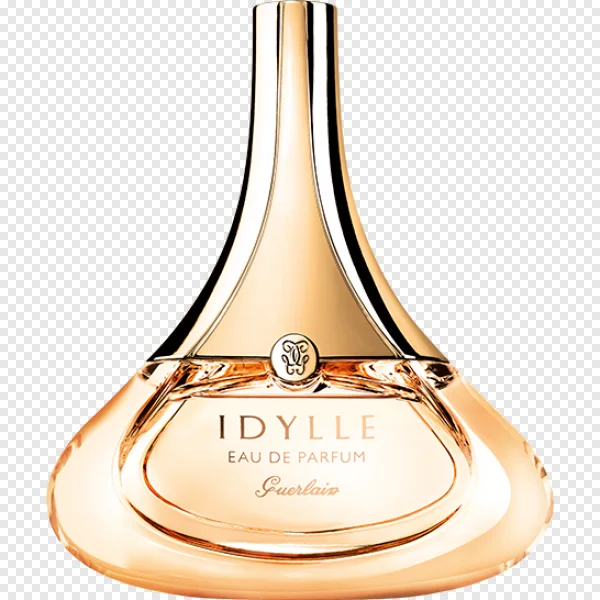 Download the exquisite Guerlain Idylle Eau de Parfum bottle PNG with a transparent background for free. This high-quality image showcases the iconic golden, teardrop-shaped bottle of the luxury floral fragrance, perfect for enhancing beauty blogs, e-commerce product listings, graphic design projects, digital marketing campaigns, or elegant presentations. Get this premium cosmetic product cutout to elevate your visual content today! Ideal for designers seeking high-end beauty assets.