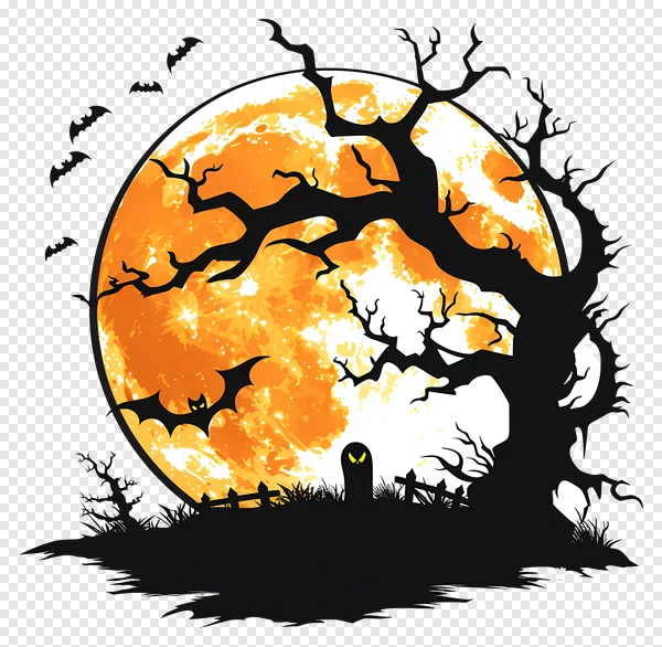 Download this stunning, high-quality Halloween full moon PNG image for free! Featuring a spooky silhouette of a bare tree, bats, a creepy cemetery with tombstones, and a vibrant orange moon, it's perfect for your Halloween projects, website graphics, social media posts, or spooky designs. Enhance your Halloween visuals with this free-to-use, transparent background image. Get creative and download now!