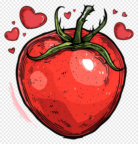 Download this delightful hand-drawn red tomato PNG, bursting with fresh appeal and surrounded by charming red hearts! This vibrant illustration features a unique sketch style with crisp black outlines and a verdant green stem, set against a transparent background for versatile use. Perfect for adding a touch of love to your Valentine's Day projects, enhancing recipe cards, food packaging, healthy eating campaigns, or any design needing a whimsical, heartfelt culinary theme. Get this high-quality, free transparent PNG and instantly elevate your graphic designs with its fresh, romantic, and organic feel.