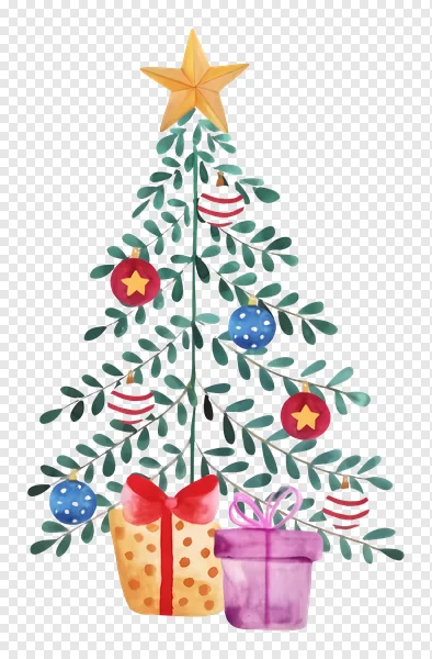 Download this charming watercolor Christmas tree PNG for free! This festive illustration features a classic green tree adorned with a radiant golden star topper, an assortment of colorful ornaments including red with stars, striped reds, and blue baubles. Two neatly wrapped gift boxes, one yellow with a red bow and one purple with a pink bow, rest beneath. With its transparent background and unique hand-painted style, this free PNG is perfect for holiday cards, digital projects, social media posts, invitations, and any creative design needing a touch of Christmas cheer. Enhance your seasonal content instantly!
