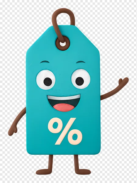 Download this vibrant, happy 3D cartoon discount tag PNG for free! This cheerful teal price tag character, featuring a prominent percentage symbol and an expressive, waving face, is perfect for announcing exciting sales and promotions. With its high-quality rendering and transparent background, it's an ideal asset for e-commerce websites, marketing campaigns, social media posts, banners, and digital advertisements. Add a playful and eye-catching element to your projects and highlight your best deals with this adorable sales icon.