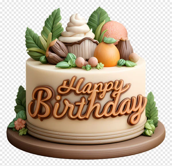 Celebrate special occasions with this charming, free-to-download Happy Birthday cake PNG. This delightful 3D rendered image features a smooth cream-colored cake, beautifully adorned with stylized green leaves, vibrant orange fruit, earthy nuts, and a fluffy whipped cream swirl. Its whimsical, almost clay-like aesthetic and transparent background make it perfect for seamless integration into digital invitations, personalized greeting cards, social media posts, party decorations, or any creative project needing a festive touch. Download this high-quality, transparent birthday cake graphic to add a unique and elegant flair to your designs today!