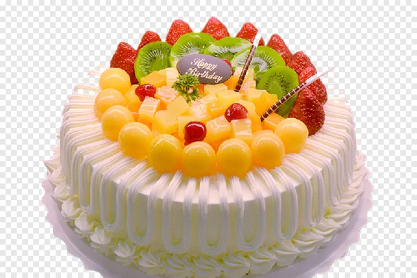 Celebrate special moments with this vibrant Happy Birthday Fruit Cake PNG! This high-quality image features a beautifully decorated round white cake generously topped with fluffy whipped cream. Adorned with a colorful array of fresh fruits including bright red strawberries, juicy green kiwi slices, diced yellow pineapple, sweet yellow melon balls, and glistening red cherries, it also includes a charming 'Happy Birthday' topper. Perfect for enhancing digital invitations, greeting cards, social media posts, party banners, or any design project needing a festive and delicious touch. Download this free PNG with a transparent background to effortlessly add sweetness and joy to your creations today!
