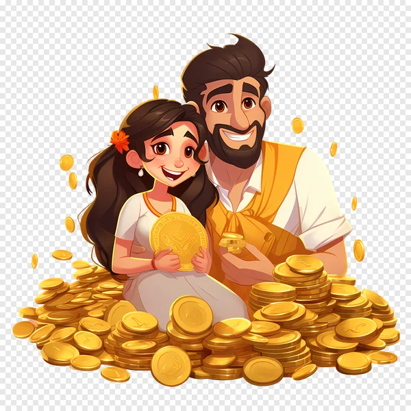 Download this vibrant, transparent PNG illustration featuring a happy cartoon man and a smiling girl, joyfully surrounded by a massive pile of glistening gold coins. With additional currency falling around them and a large coin held by the girl, this charming image perfectly symbolizes wealth, financial success, prosperity, and abundance. Ideal for projects related to finance, gaming, educational content, celebrating achievements, or any design needing a cheerful representation of money and good fortune. Get this high-quality, free PNG to enhance your digital designs, presentations, or marketing materials with a touch of rich success!