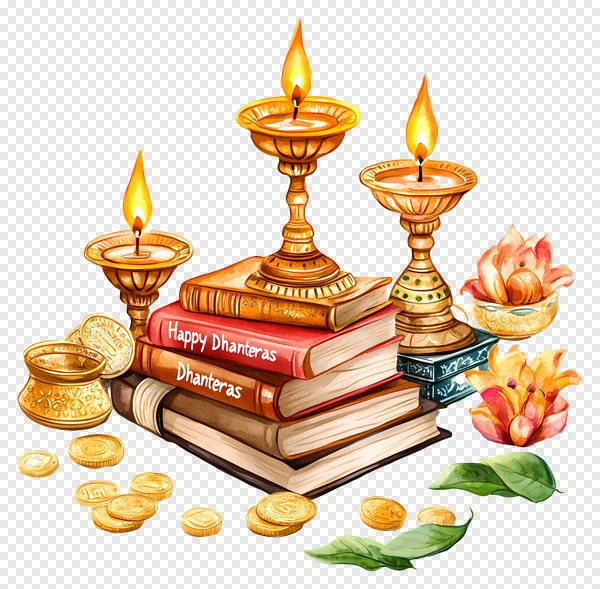 Tags: Dhanteras Diwali Happy Dhanteras Hindu festival Indian festival Lakshmi Puja auspicious books celebration diya festive season gold coins greeting card kalash lotus flower oil lamp prosperity spiritual traditional transparent PNG watercolor illustration wealth
