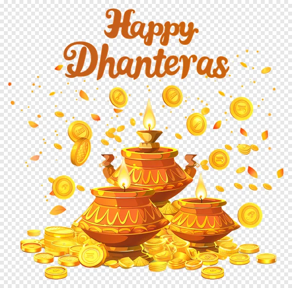 Celebrate the auspicious festival of Dhanteras with this vibrant, high-quality PNG image featuring 'Happy Dhanteras' text, traditional clay oil lamps (diyas) glowing warmly, and an abundance of shimmering gold coins symbolizing wealth and prosperity. Perfect for sending festive greetings, designing social media posts, creating custom greeting cards, or adding a touch of Indian cultural celebration to your graphic design projects. Download this beautiful illustration for free with a transparent background and wish your loved ones a Happy Dhanteras filled with good fortune and joy. Ideal for Diwali preparations and conveying auspicious blessings.