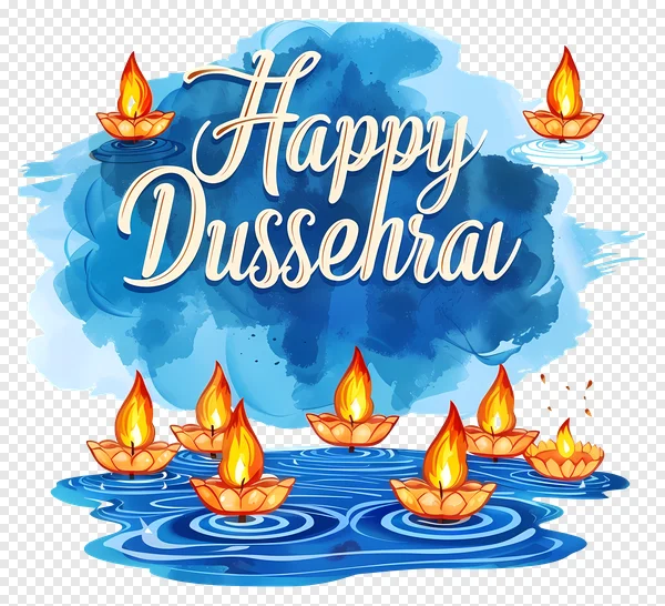 Celebrate the victory of good over evil with this beautiful Happy Dussehra PNG image! Featuring glowing diya lamps and a vibrant blue watercolor background, this free download is perfect for creating festive greetings, social media posts, invitations, and more. Enhance your Dussehra celebrations with this high-quality, transparent PNG. Download now and spread the joy!