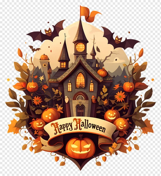 Download this stunning Happy Halloween castle illustration as a free PNG! Perfect for creating spooky Halloween graphics, party invitations, social media posts, or adding a festive touch to your website. This high-quality image features a haunted castle surrounded by pumpkins, bats, and autumn foliage. Get your free download now and make this Halloween extra special!