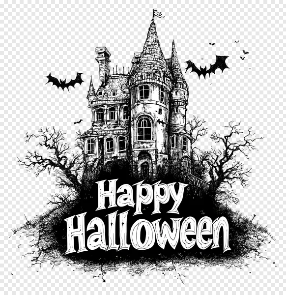 Conjure up some spooky spirit with this Happy Halloween Haunted House PNG! Download our free, high-quality black and white illustration featuring a chilling gothic mansion, eerie bare trees, and flying bats against a dark background. This vintage-style, hand-drawn graphic is perfect for your Halloween party invitations, digital designs, social media posts, trick-or-treat decorations, or any project needing a classic scary touch. Get this creepy haunted house design for free today and make your Halloween visuals truly stand out for the spooky season!