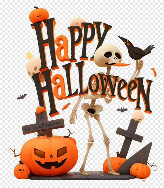 Dive into the spooky fun of Halloween with this vibrant, high-quality PNG image! Featuring a charming 3D skeleton alongside grinning jack-o'-lanterns, creepy gravestones, a watchful crow, and flying bats, all framing bold 'Happy Halloween' text. Its transparent background makes it perfect for effortless integration into social media posts, party invitations, website banners, craft projects, or any digital design. Capture the festive spirit and download this free, ready-to-use Halloween illustration today to add a touch of playful fright to your creations!