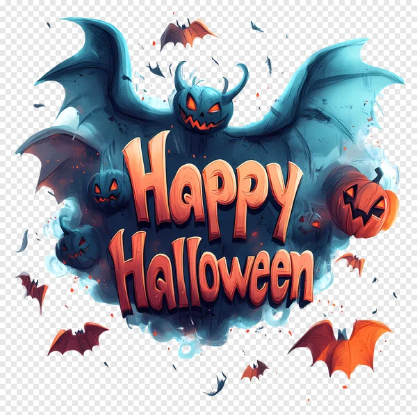 Download this stunning "Happy Halloween" PNG image for free! Featuring a spooky bat-shaped pumpkin with glowing jack-o'-lanterns and fluttering bats, it's perfect for Halloween designs, social media graphics, party invitations, and more. High-resolution and transparent background for easy integration into your projects. Get your free download now and add a touch of Halloween magic!