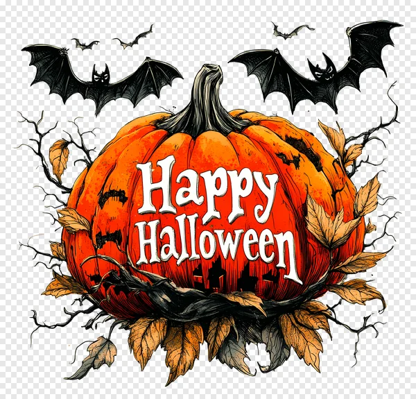 Get into the Halloween spirit with this stunning, high-quality Happy Halloween pumpkin PNG! Featuring a beautifully detailed pumpkin with spooky bat wings and autumn leaves, this free download is perfect for creating festive graphics, invitations, social media posts, and more. Enhance your Halloween projects with this unique and versatile design. Download now and add a touch of spooky charm to your creations! Transparent background for easy integration.