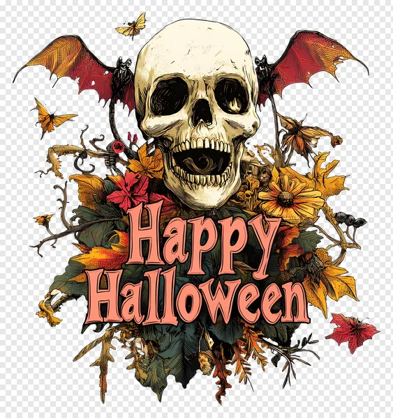 Get into the Halloween spirit with this stunning, high-resolution skull and floral PNG image! Featuring a detailed skull surrounded by autumn leaves, bats, mushrooms, and a vintage 'Happy Halloween' text, it's perfect for creating spooky designs, Halloween cards, party invitations, social media graphics, and more. Download this free PNG with a transparent background and add a touch of eerie elegance to your projects. No attribution required!