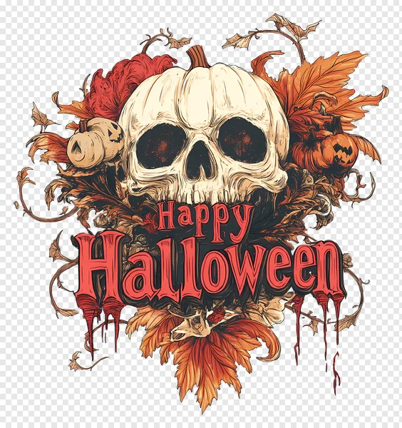 Get spooky with this stunning Happy Halloween graphic! This high-quality PNG features a detailed skull surrounded by pumpkins, autumn leaves, and dripping blood, perfect for your Halloween projects. Download now for free and use it for invitations, social media posts, t-shirt designs, or any other creative endeavor. Transparent background for easy integration. Enhance your Halloween celebrations with this eerie and beautiful design!