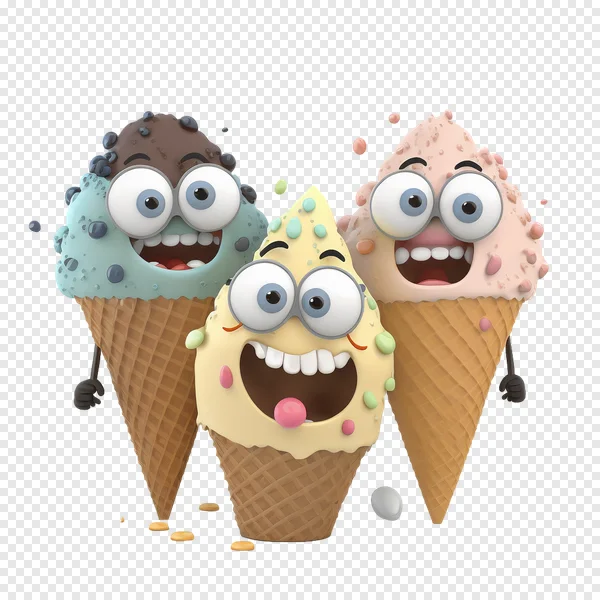 Bring a smile to your designs with this adorable free PNG featuring three happy ice cream cones! These vibrant, anthropomorphic 3D cartoon characters showcase distinct flavors—a cool minty blue with chocolate chips/blueberries, a sunny yellow with colorful sprinkles, and a delightful pink with tiny candies. Each cone boasts big, expressive eyes and wide, cheerful smiles, exuding pure joy and playfulness. Perfect for summer themes, food blogs, kids' projects, party invitations, digital art, social media, or any creative endeavor needing a sweet, fun touch. Download this high-quality transparent PNG image today and add a burst of flavor to your graphics without any cost!