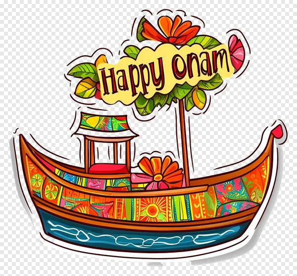 Download this beautiful Happy Onam Festival Boat PNG image for free! This vibrant, cartoon-style illustration features a traditionally decorated Kerala boat, reminiscent of a vallam or snake boat, adorned with intricate patterns, bright colors, and festive floral elements. The cheerful "Happy Onam" text is prominently displayed, making it perfect for creating greeting cards, social media posts, banners, and digital invitations to celebrate the harvest festival of Onam. Add a touch of South Indian culture and festive cheer to your designs with this high-quality, transparent PNG. Ideal for both personal and commercial projects, get your free download today!