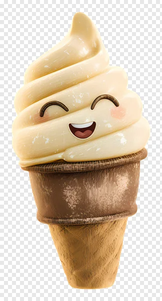 Brighten your projects with this adorable happy vanilla soft serve ice cream cone PNG! This charming 3D rendered illustration features a sweet, smiling face with blushing cheeks and closed eyes, topped on a textured waffle cone. Perfect for adding a touch of joy to summer themes, food blogs, children's content, digital art, marketing materials, and more. Its transparent background ensures seamless integration into any design. Download this delightful, kawaii-style dessert graphic for free and spread some sweetness!