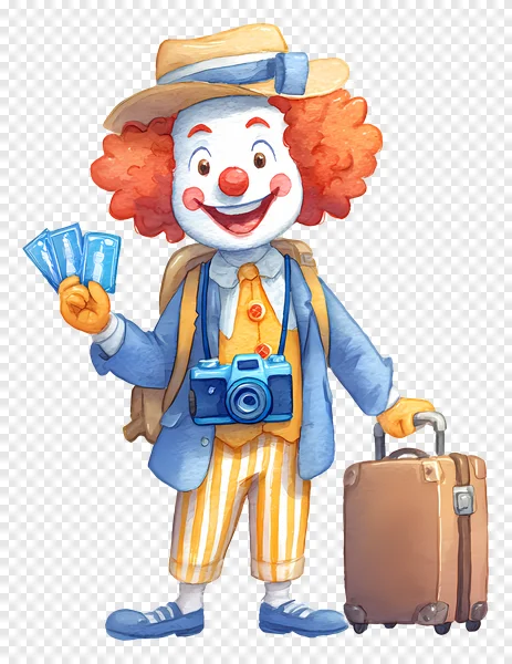 Download this vibrant, high-quality PNG of a happy traveling clown for your creative projects! This cheerful cartoon tourist character is ready for adventure, featuring a distinctive straw hat with a blue band, bright red curly hair, and a wide, friendly smile. He's fully equipped with a blue camera around his neck, holding blue travel tickets in one hand, and pulling a brown rolling suitcase with the other, all while sporting a comfortable backpack. Dressed in a blue blazer and yellow striped pants, this watercolor-style clown is perfect for travel-themed designs, event invitations, blogs, children's projects, or adding a touch of humor, fun, and wanderlust to any digital or print media. Get this transparent image absolutely free!