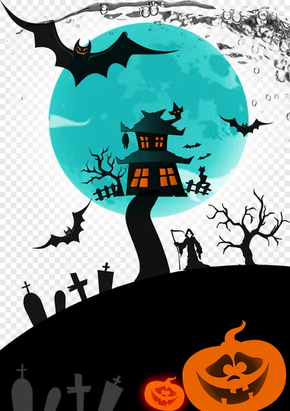 Tags: Halloween Halloween night bare trees bats eerie festive full moon gravestones graveyard grim reaper haunted haunted house jack-o'-lantern night pumpkins scary silhouette spooky teal moon transparent PNG