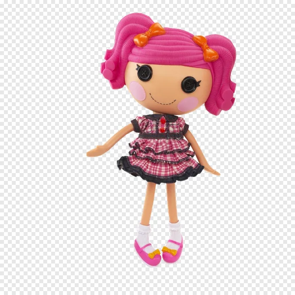 Download this adorable Lalaloopsy doll PNG image for free! Featuring her iconic bright pink yarn hair styled in pigtails with cute orange bows, charming button eyes, and a sweet stitched smile. Dressed in a delightful pink and white plaid ruffled dress with dark trim and red buttons, complete with white socks and pink Mary Jane shoes adorned with yellow bows, this high-quality transparent background image is perfect for children's craft projects, digital scrapbooking, educational materials, or adding a whimsical touch to any design. Get your free Lalaloopsy graphic now for personal and creative use!