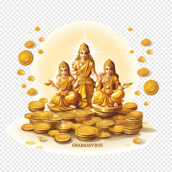 Download this stunning free PNG of the Hindu Goddess Lakshmi, radiating divine prosperity amidst a cascade of glittering gold coins. This high-quality illustration, featuring three elegant deities in golden attire on a pile of riches, is perfect for your spiritual designs, Diwali greetings, financial presentations, or any project seeking to symbolize wealth, abundance, and good fortune. With its transparent background, seamless integration into your creative work is effortless. Enhance your graphics with this beautiful, royalty-free sacred image and invite prosperity into your visual storytelling.