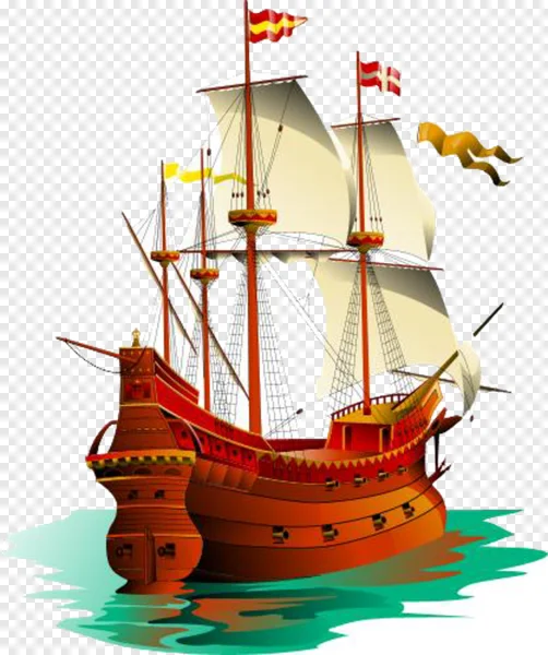 Embark on a visual voyage with our stunning, free PNG of a historic galleon sailing ship. This beautifully detailed vector illustration features a classic wooden vessel with striking red and brown hull, majestic white sails unfurled, and vibrant flags waving in the wind. Perfect for adding a touch of adventure and history to your creative projects, presentations, websites, or educational materials. Whether you're designing for a pirate theme, historical event, or simply love nautical aesthetics, this transparent, high-quality image is ready for instant download. Capture the spirit of exploration and ancient seas – download your free galleon ship PNG today!
