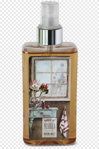 Download this high-quality free PNG of a House of Maria Luxurious Room Mist spray bottle. Featuring an elegant label with a rustic window scene, vibrant King Protea flowers in a vase, and a quaint distressed wooden table, this home fragrance bottle embodies sophistication and comfort. The amber liquid and silver pump accent its luxurious appeal. Perfect for graphic designers, bloggers, or anyone needing a transparent product image for mockups, e-commerce, marketing materials, or lifestyle content. Enhance your projects with this beautifully designed room mist bottle PNG today!