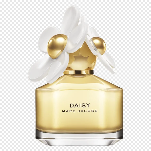 Discover and download a high-quality, free PNG image of the iconic Marc Jacobs Daisy perfume bottle. This transparent background asset showcases the luxurious gold-tinted liquid within a clear base, topped with its signature elegant white daisy floral cap and shimmering golden accents. Ideal for beauty bloggers, e-commerce stores, graphic designers, digital marketing campaigns, or personal creative projects needing a sophisticated fragrance visual. Enhance your content with this beautiful, isolated product shot, ready for instant use.