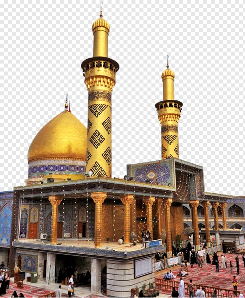 Download a stunning, high-resolution PNG image of the Imam Hussein Shrine in Karbala, Iraq. This beautiful depiction showcases the golden dome and intricate Islamic architecture of this sacred site. Perfect for religious projects, educational materials, travel blogs, or any design needing a powerful symbol of faith and history. Get your free download now and enhance your visuals with this iconic landmark!
