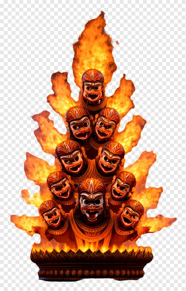 Immerse yourself in ancient mythology with this stunning free PNG featuring a stacked pyramid of fiery Ravana masks. This intricate digital artwork showcases multiple fierce, grinning faces of the Hindu demon king, enveloped in vibrant orange and red flames against a stark black background. Perfect for projects needing a powerful, mystical, or cultural touch. Ideal for graphic design, presentations, digital art compositions, or educational materials. Download this high-quality, transparent PNG for free and bring a dramatic, mythical flair to your creative work today!