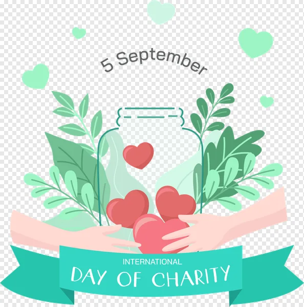 Download this beautiful International Day of Charity PNG image for free! Featuring hands gently holding a glass jar filled with red hearts, surrounded by leafy branches and floating hearts. Perfect for websites, social media, presentations, or any project supporting charitable causes. Celebrate September 5th with this heartwarming and versatile graphic. High-resolution and transparent background for easy integration. Get your free download now!
