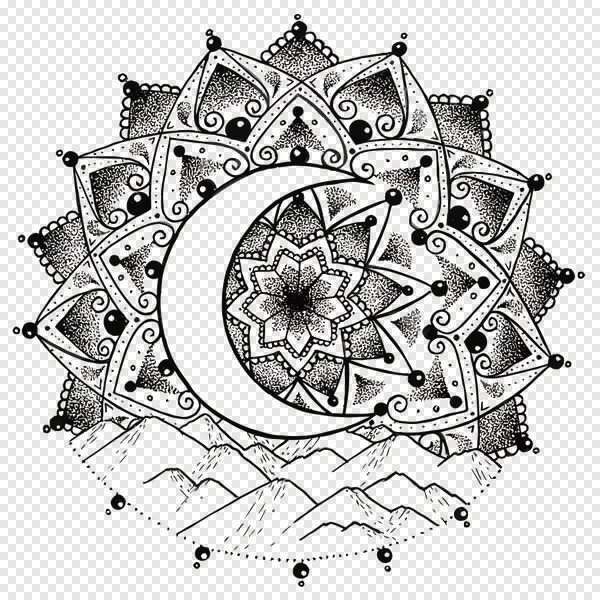 Tags: black and white bohemian celestial crescent moon detailed dot art free PNG illustration intricate line art mandala meditative moon mountains mystical nature sacred geometry spiritual art stippling tattoo design