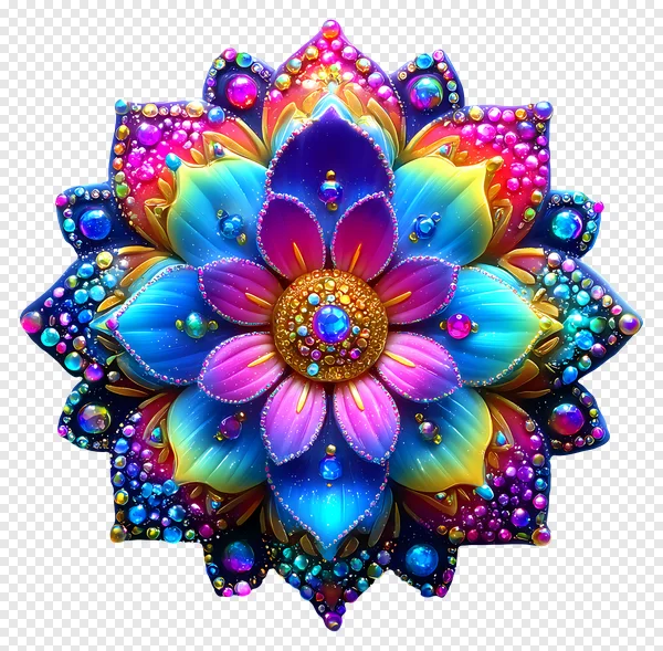 Tags: abstract floral bright colors colorful digital illustration fantasy flower gemstone mandala glossy golden center intricate iridescent jewel-encrusted jeweled flower multi-layered ornate psychedelic sparkling spiritual art symmetrical transparent background vibrant lotus