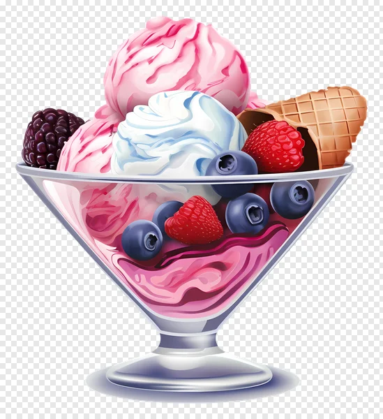 Indulge in this vibrant, high-quality PNG image of a delicious berry ice cream sundae! Featuring creamy pink strawberry or raspberry swirls, fluffy white whipped cream, fresh blueberries, juicy red raspberries, a dark blackberry, and a crispy waffle cone piece, all artfully arranged in an elegant glass sundae dish. This transparent dessert graphic is perfect for adding a sweet, refreshing touch to your food blogs, restaurant menus, summer promotions, social media posts, or any design project. Download this appetizing, free ice cream sundae PNG to enhance your creative visuals with a burst of flavor and color today!