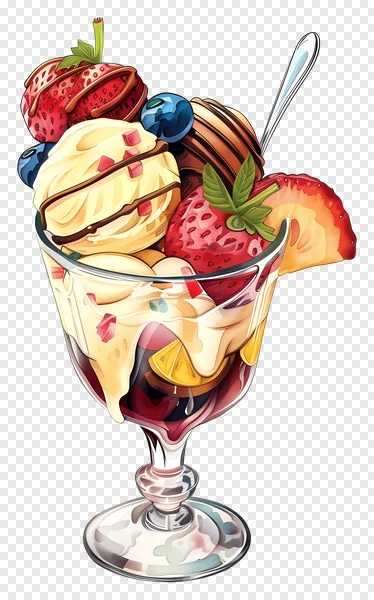 Indulge in this mouth-watering, high-quality Ice Cream Parfait PNG image, perfect for adding a sweet touch to your projects! This vibrant illustration features creamy vanilla and rich chocolate ice cream scoops, generously adorned with fresh, juicy strawberries and plump blueberries. Served elegantly in a classic glass sundae dish with a spoon and rich chocolate drizzle, this layered dessert graphic is a feast for the eyes. Download this free, transparent PNG for your restaurant menus, food blogs, social media campaigns, recipe websites, or any design needing a delicious and captivating dessert illustration. Get your free sweet treat graphic now!
