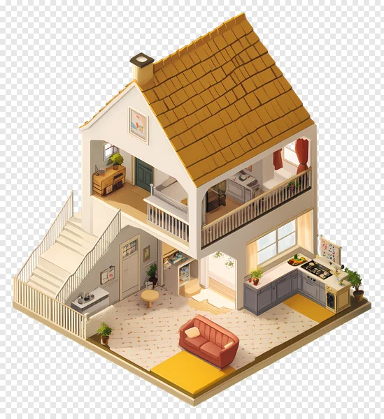 Download this beautifully detailed isometric house cutaway PNG for free! Perfect for architectural visualizations, game development, illustrations, and design projects. This high-quality image showcases a two-story home with interior details like furniture, kitchen appliances, and a cozy living space. Use it to add a unique perspective to your work – no attribution required! Get your free download now and enhance your creative projects with this stunning isometric illustration.