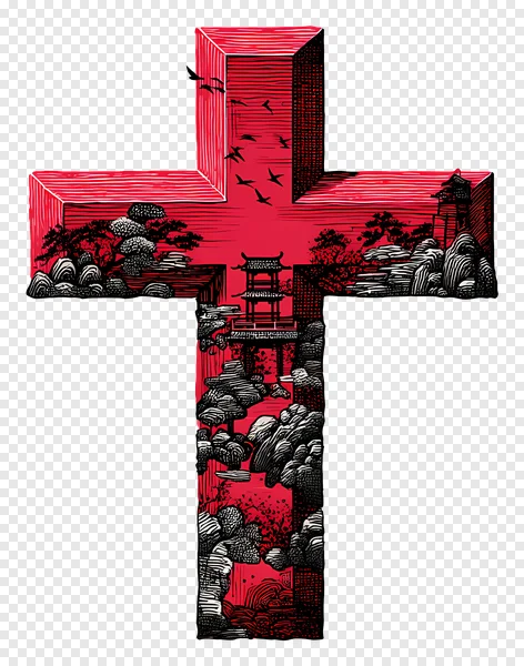 Download this stunning Japanese landscape cross PNG image for free! Featuring a detailed, red-toned illustration of traditional Japanese architecture, serene gardens, and flying birds, this graphic is perfect for digital art, design projects, backgrounds, and more. High-resolution and transparent background for easy integration. Enhance your creative work with this unique and beautiful design – download now!