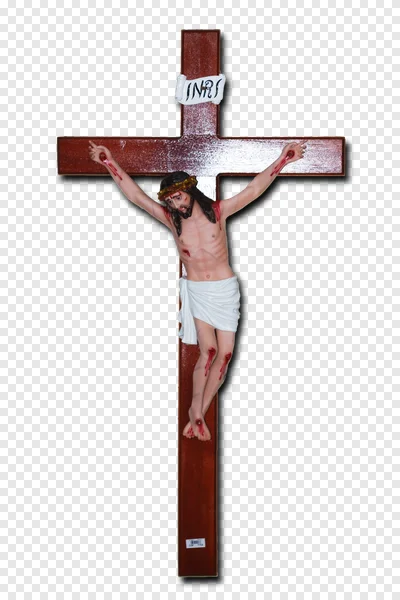 Download this poignant PNG image of Jesus Christ crucified on a brown wooden cross for free. This high-quality depiction features Jesus with a crown of thorns, visible wounds, and the 'INRI' sign above his head, all set on a transparent background for effortless integration into your designs. Perfect for Christian themed projects, church bulletins, educational materials, spiritual reflections, or any digital content requiring a reverent representation of the sacrifice. Enhance your religious art, presentations, or personal devotions with this powerful symbol of faith and redemption. Get your free transparent crucifix PNG now!