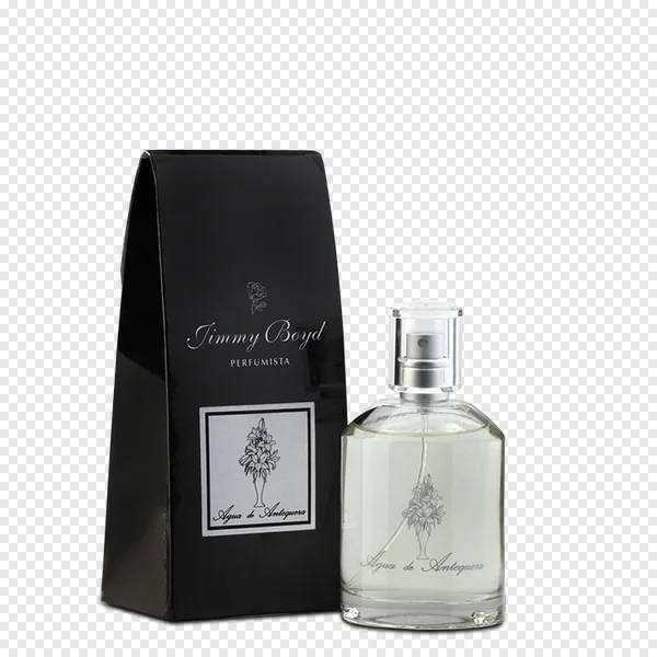 Download this stunning, high-quality PNG image of a Jimmy Boyd Agua de Antequera perfume bottle and its elegant black packaging box. This luxurious fragrance features a clear glass bottle with a delicate floral illustration and a sleek silver spray cap, perfectly complemented by the matching 'PERFUMISTA' branded black box. Ideal for beauty blogs, e-commerce product displays, graphic design projects, or professional presentations, this free transparent background image adds a touch of sophistication to any creative work. Get your free download now!