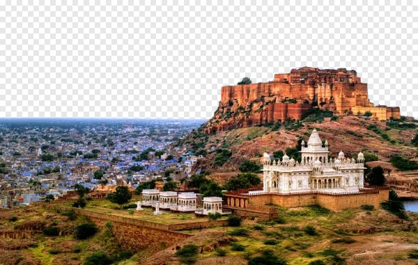 Download this stunning high-resolution PNG image showcasing the majestic Jodhpur Fort and the serene Jaswant Thada in Jodhpur, India. Perfect for travel blogs, presentations, or any project needing a breathtaking view of Rajasthan's architectural marvels. The image offers a vibrant contrast of the red sandstone fort against the white marble mausoleum, complemented by the sprawling blue city below. Download now and enhance your visual projects with this captivating scene!