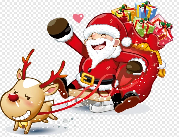Spread holiday cheer with this adorable free PNG featuring a jolly Santa Claus happily riding his sleigh! Pulled by a determined, red-nosed reindeer (evoking Rudolph), Santa's sack overflows with colorful Christmas gifts, ready for delivery. This vibrant cartoon illustration captures the magic of the season, perfect for your festive projects, greeting cards, website banners, or holiday crafts. Download this high-quality image with a transparent background for instant use and bring the spirit of Christmas to life!