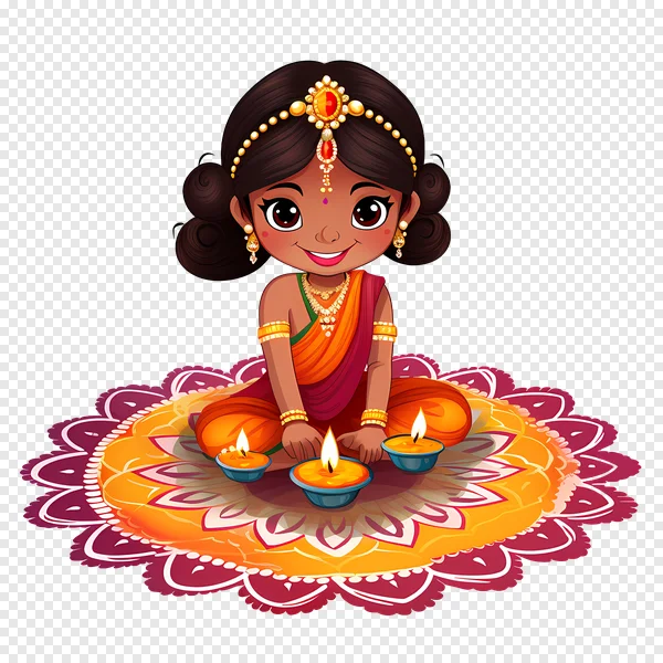 Download this adorable free PNG of a joyful cartoon Indian girl, beautifully dressed in traditional attire, sitting gracefully on a vibrant rangoli with three lit diyas. Perfect for celebrating Diwali, Deepavali, or any Indian festival and cultural event. This high-quality illustration features a transparent background, making it ideal for greeting cards, invitations, educational materials, social media posts, and various creative projects. Enhance your designs with this charming, culturally rich image. Get your free download now!